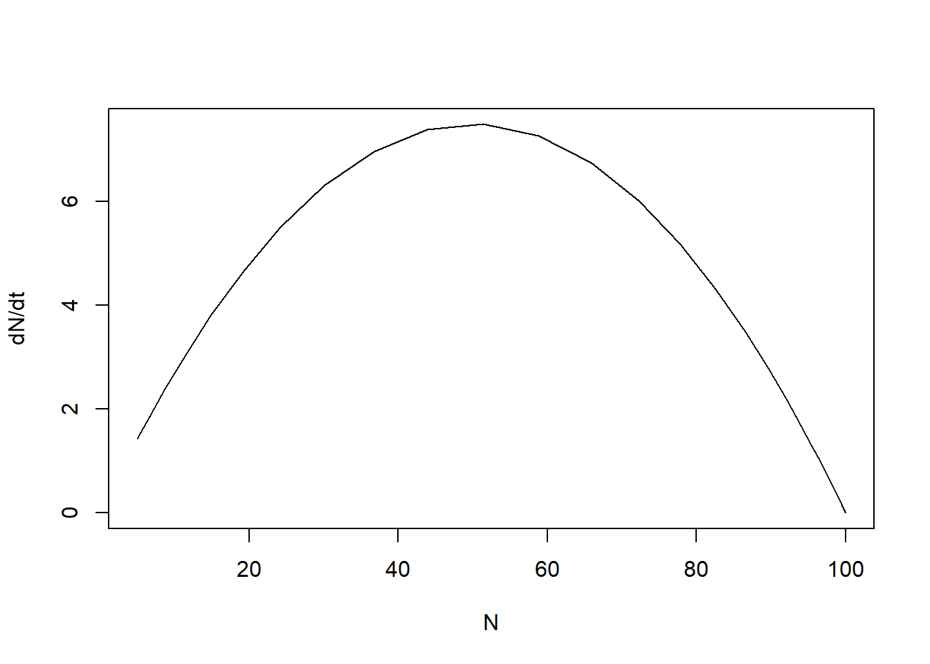 plot(states[,"N"], states[,"dNdt"], type = "l", xlab = "N", ylab = "dN/dt")