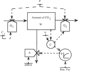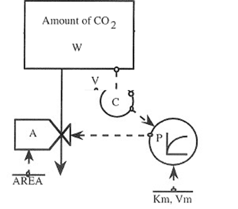 The CUVET1 approach will rapidly result in depleted CO2 levels in the chamber and is thus not appropriate for measuring rates of photosynthesis for longer periods. Tubes are therefore added to the chamber to create a CO2 inflow (use symbol ) and CO2 outflow (), which is described in a model called CUVET2. We can assume that the incoming air flows at a constant rate and consists of a constant CO2 concentration (), that the air pressure is constant, that the outflowing air flows at the same rate , and that there is a perfect mixture of the air inside the chamber.