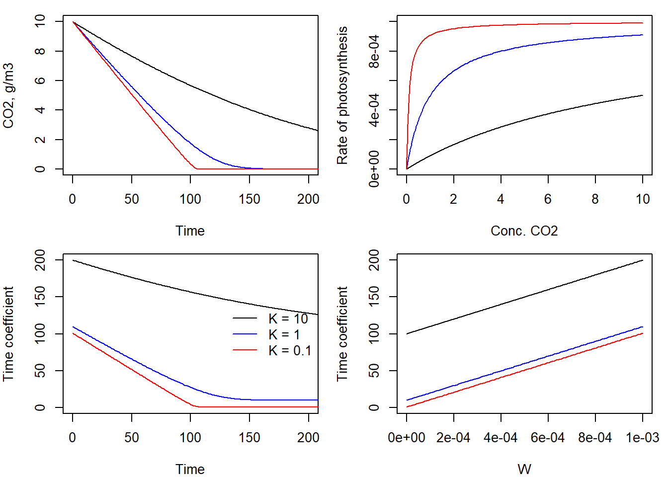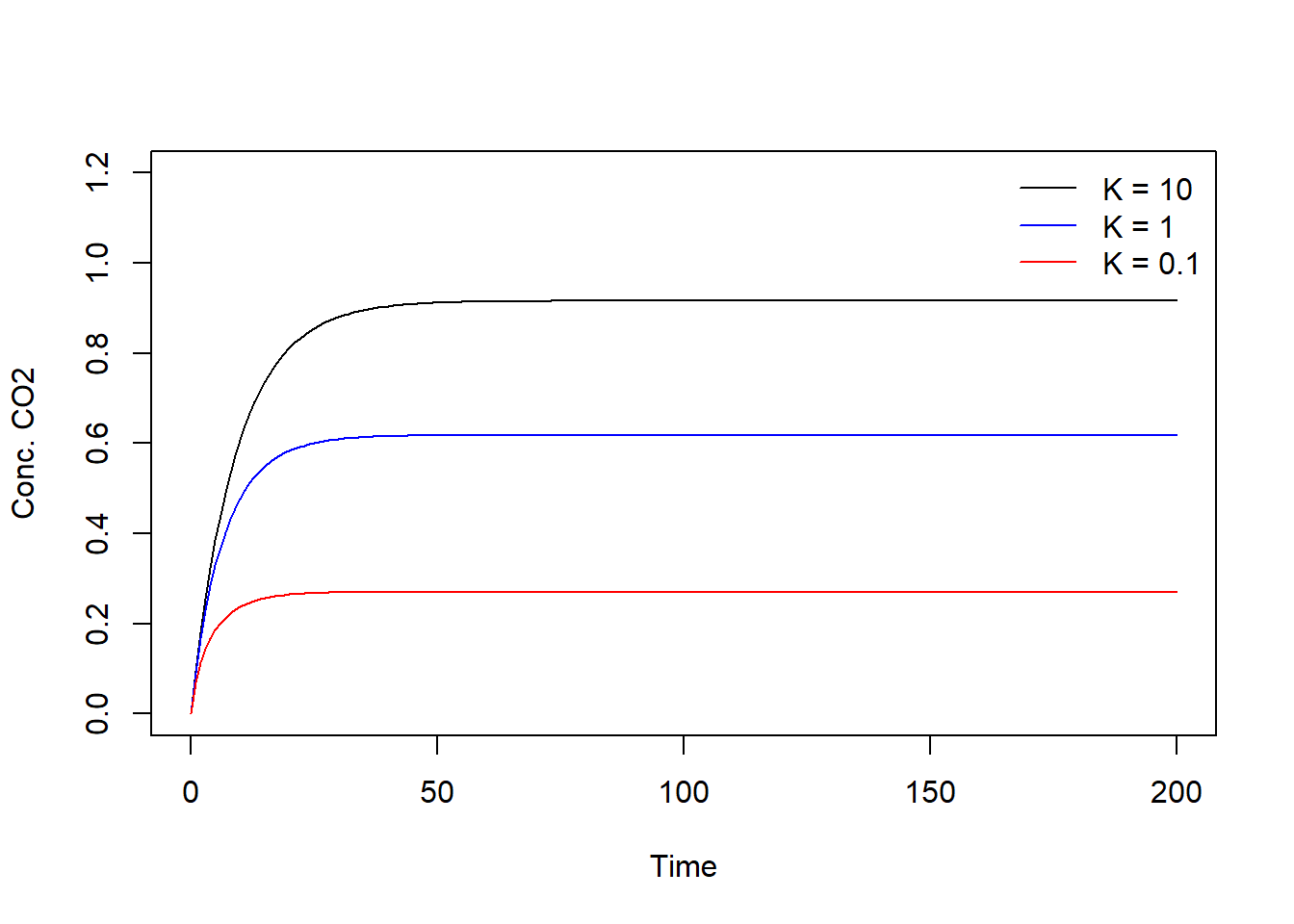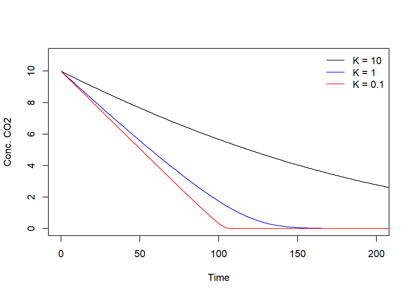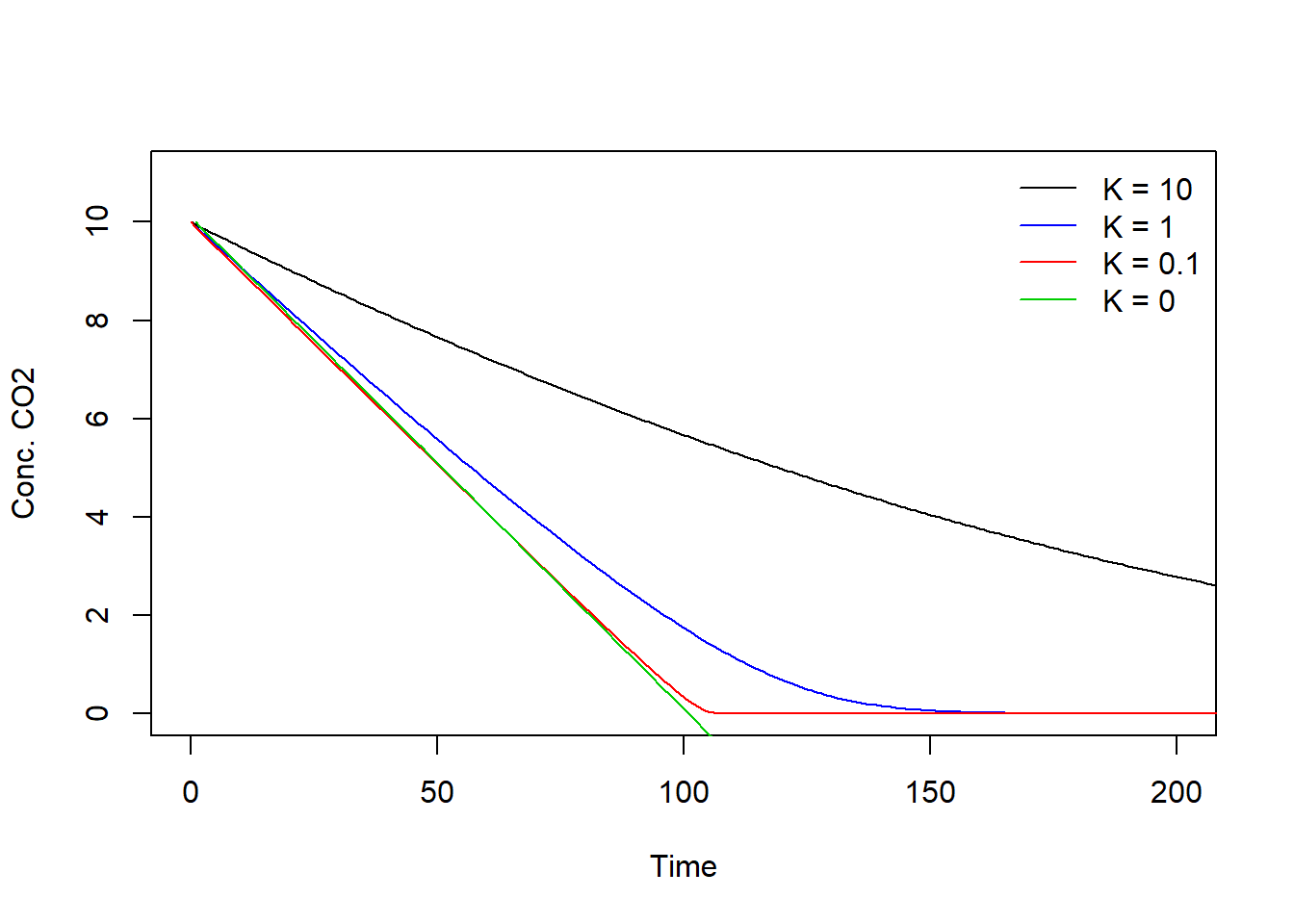 type = "l", xlim = c(0, 200), ylim = c(0, Cini), xlab = "Time", ylab = "CO2, g/m3", col = "black")