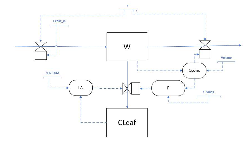 We continue with a model that calculates leaf photosynthesis rates in an open leaf chamber system (e.g. Exercise 5.2). We add the carbon in the leaf as part of the system and therefore reconsider the system boundaries. It makes sense to express all states in the amount of carbon, grams of . Note that this will also change the unit of in gC m-2 s-1.