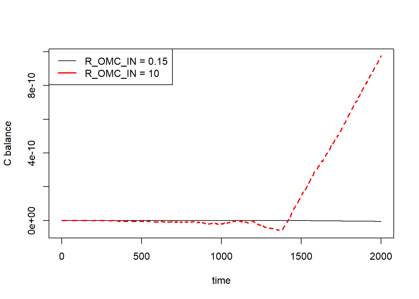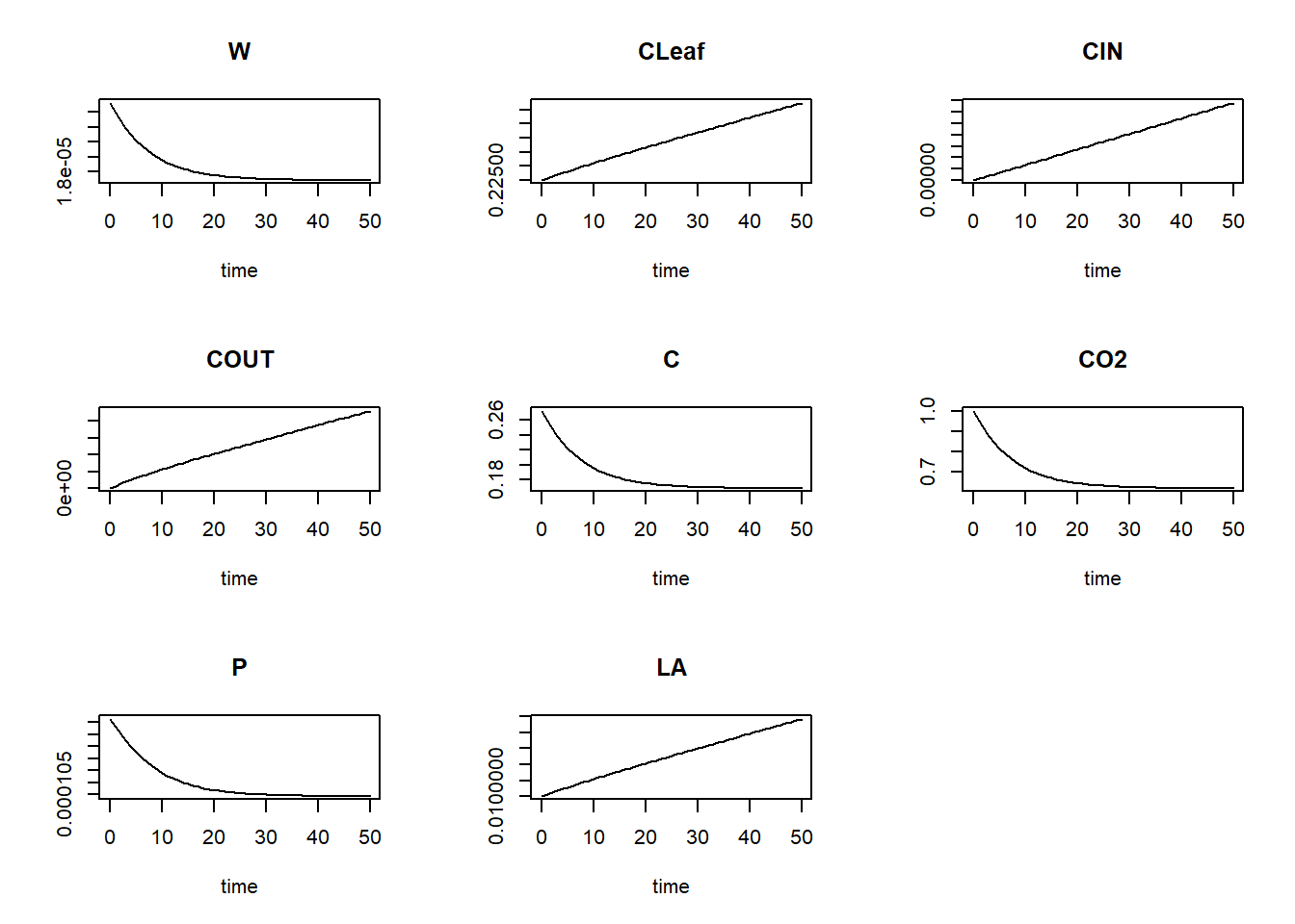 To check the mass balance, we now not only need to integrate the amount of C in the chamber and in the leafs, we now also need to keep track of all C that has entered the chamber (thus we need to integrate CIN), as well as all C that has left the chamber (we thus need to integrate also COUT). Hence, we now have two extra ‘state’ variables to make the mass balance check possible (CIN and COUT: they are not the real state variables were are interested in, but we need them for mass balance book-keeping).