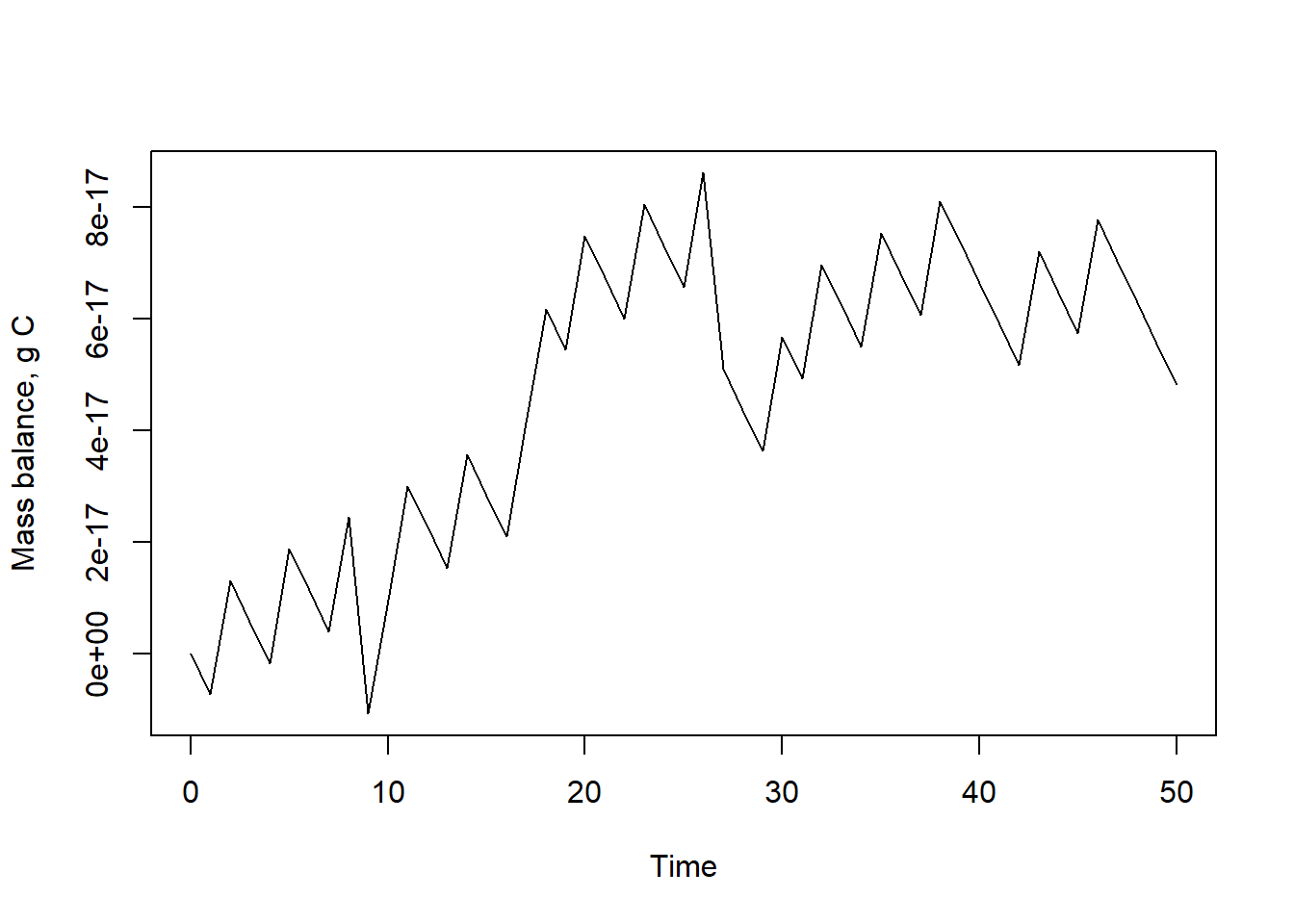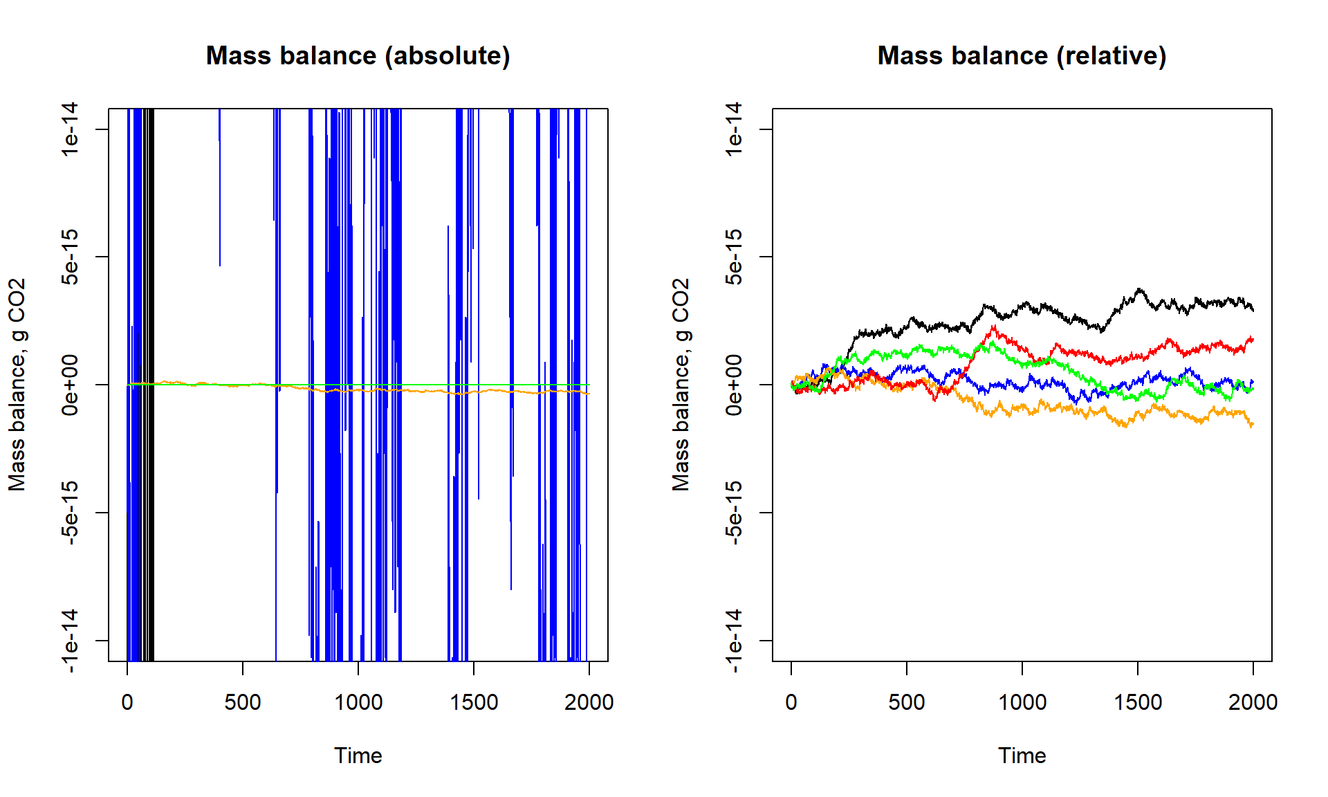 ylim = c(-1e-14, 1e-14), ylab = "Mass balance, g CO2", col = "black")