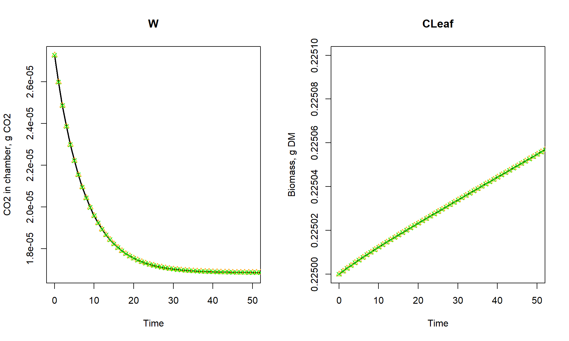 points(states_t[,"time"], states_t[,"CLeaf"] * 1e6, col = "green", pch = 4)