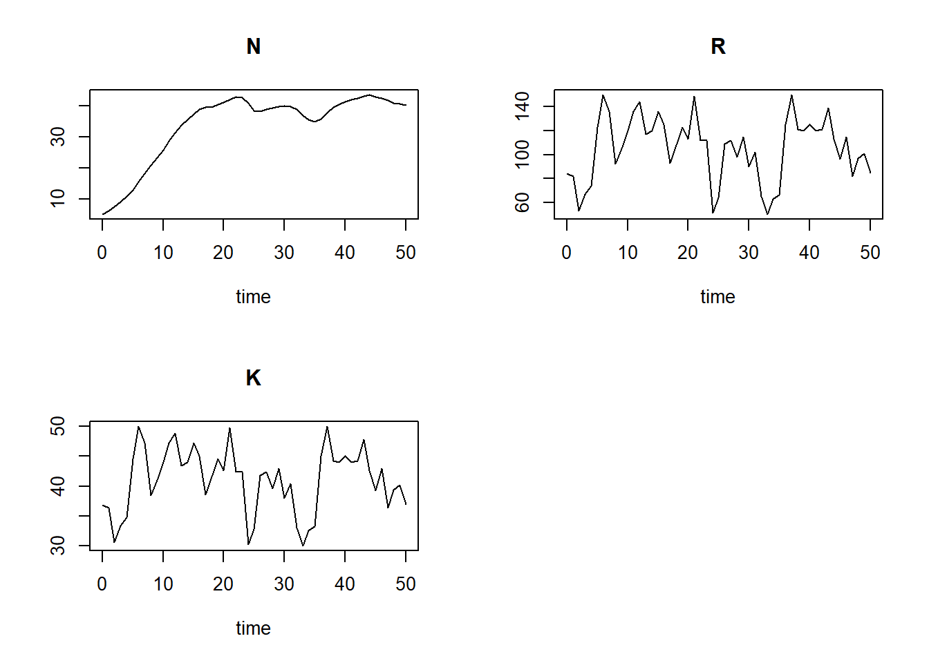 plot(surveyData$t, surveyData$R, type="l", xlab="time", ylab="resources")
