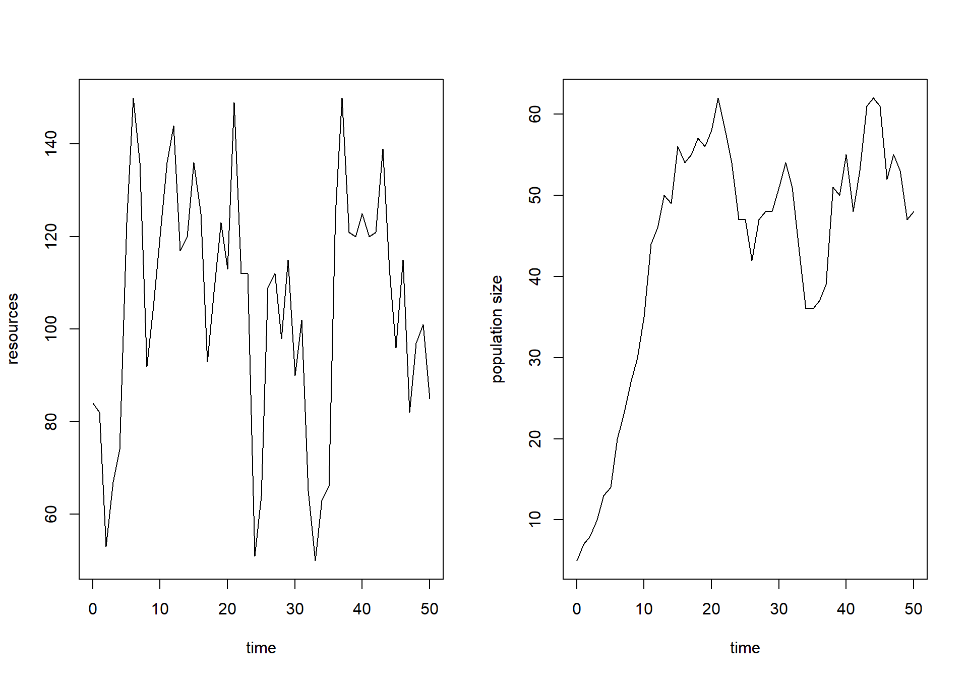 “resources” and “population size” as y-axis labels for the two plots.