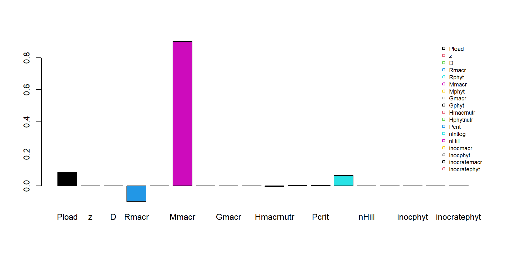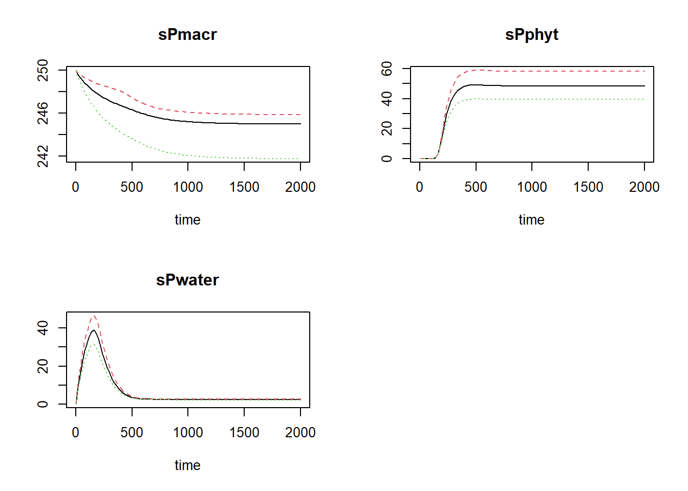 Select three parameters for sensitivity analysis. Run both a sensitivity analysis (sensu stricto), and also an elasticity analysis, which is a normalized version of sensitivity (see textbook and lectures for differences). Run the model three times (2000 days) but with different parameter values: at the default parameter value, at the default parameter value -10%, and at the default parameter value +10%. Study the effects of these parameter values for the state variables: sPmacr. Visualize by plotting the results. For visualization you can first best plot the state variable(s) of interest against time (possibly with multiple scenarios in a single plot; a separate line for each scenario). Moreover, you can opt for a barplot showing the sensitivity and elasticity index values for the parameters.