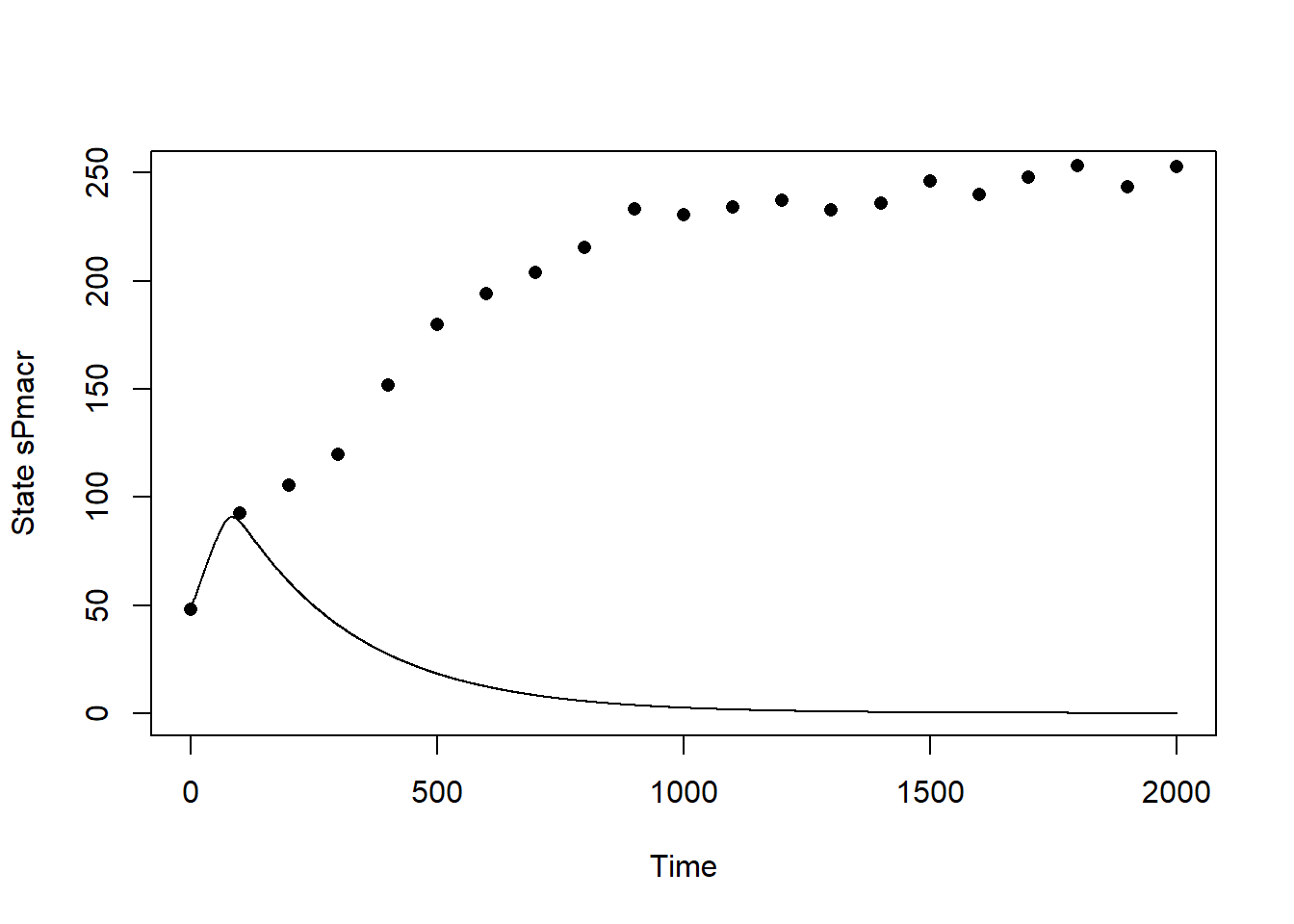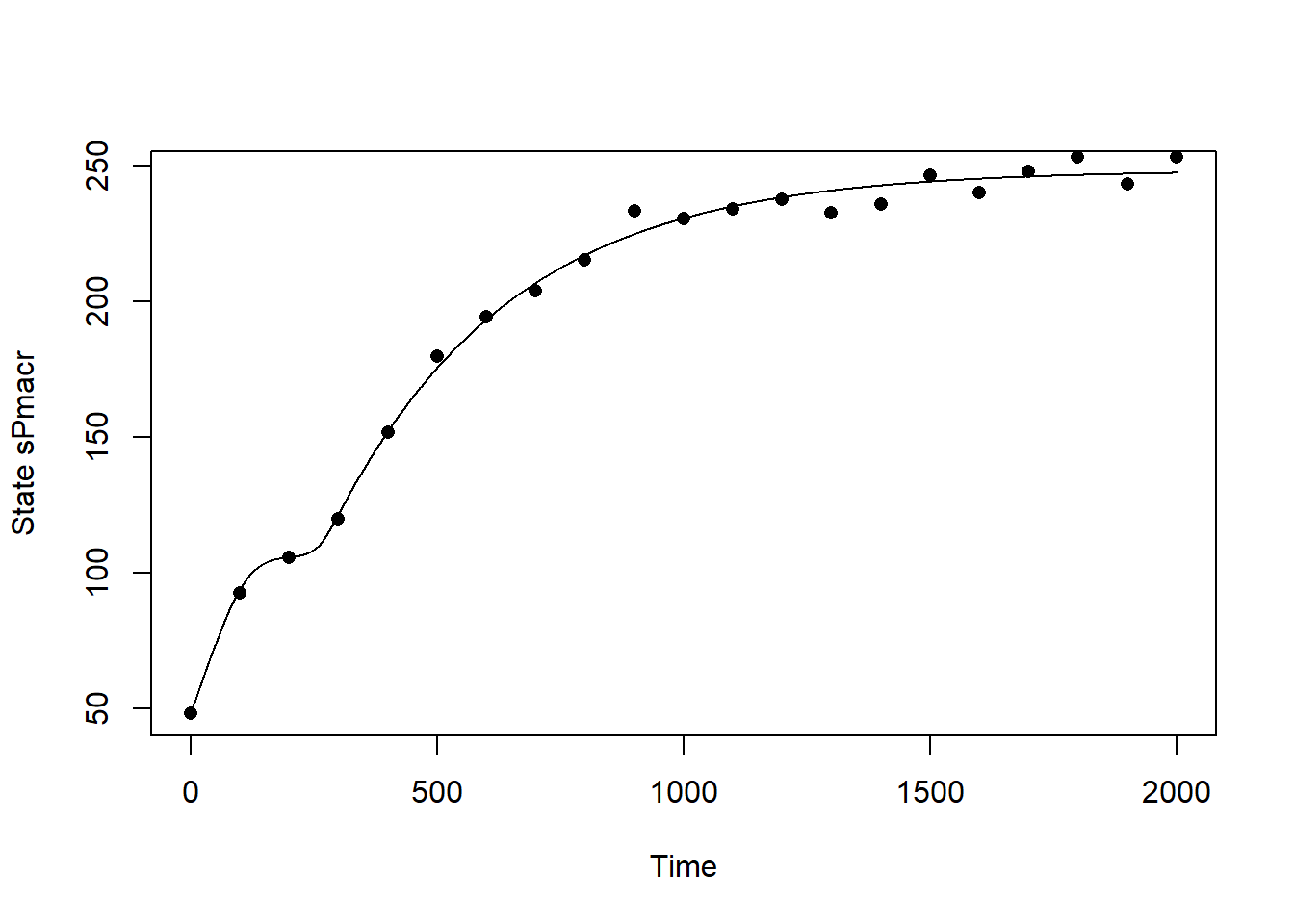 Also, we can plot the modelled pattern of state “sPmacr” as function of time, including the measured values of “sPmacr”: