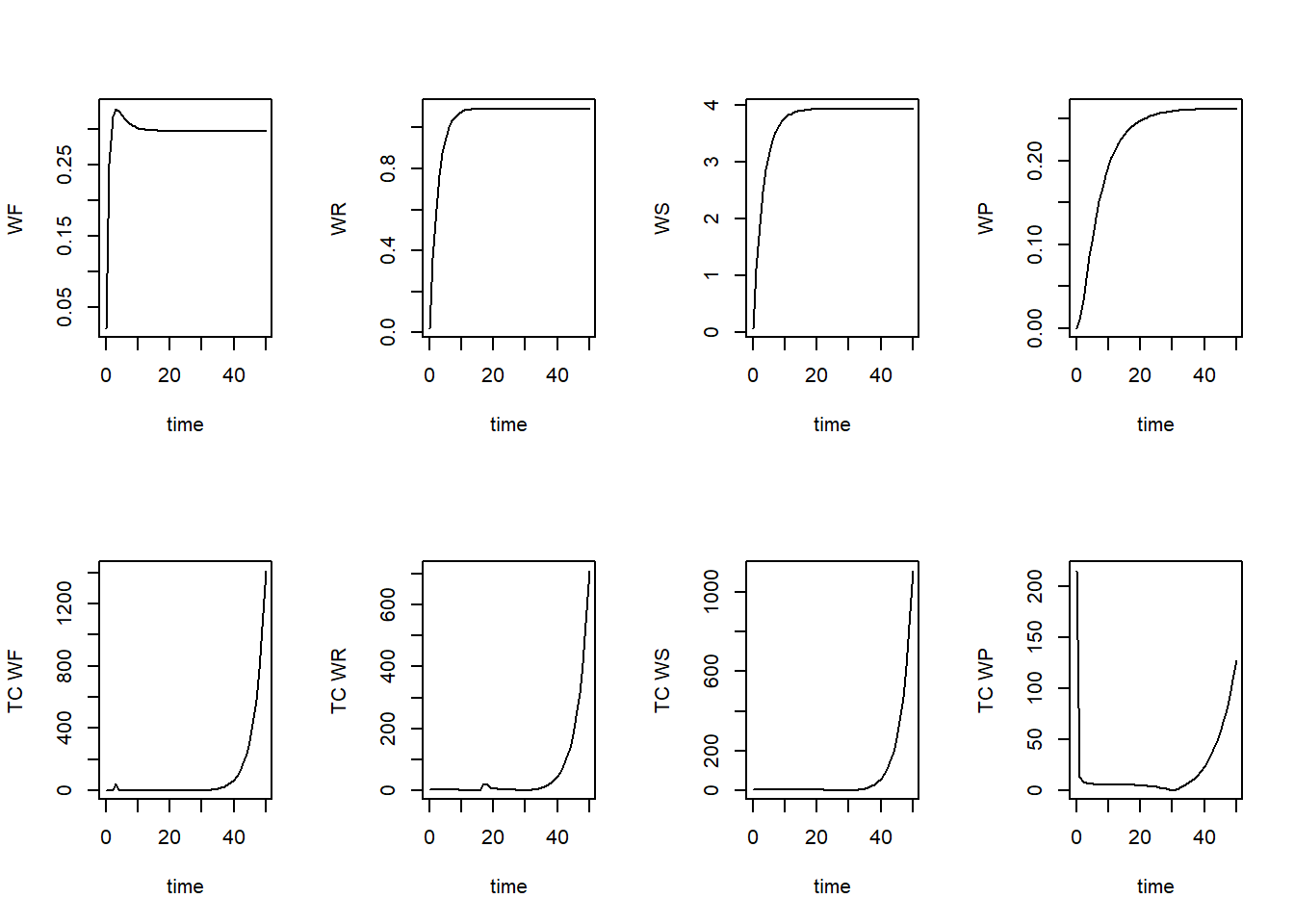 You can also calculate the relative deviation of Euler when compared to the ode45 results (by computing |Euler state-RK state|/RK state , for example at time = 50 years). Within what range of time-step values do state variables not differ more than 1% after a reasonable time period (50 years)?