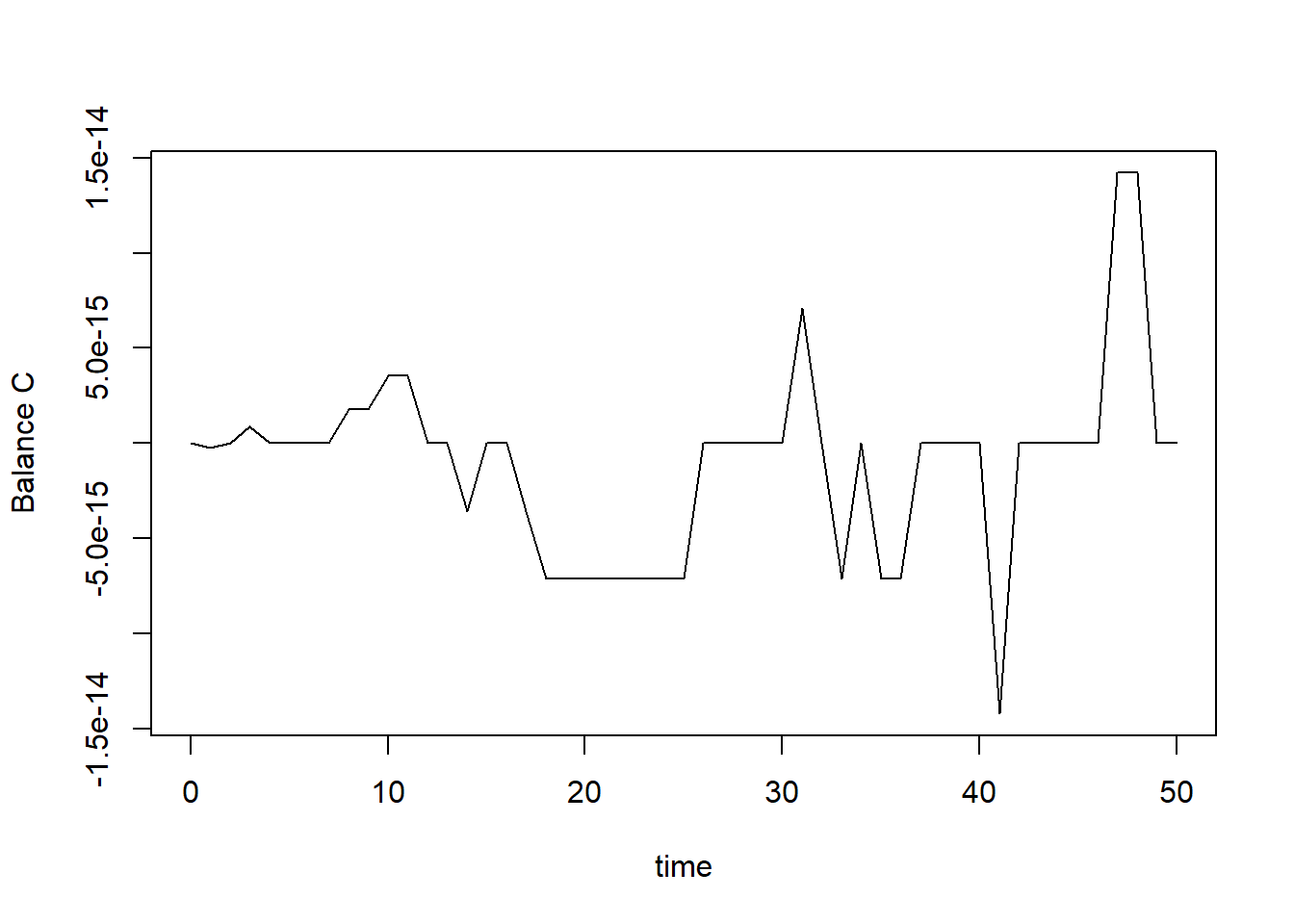 plot(states[,"time"], balance, type = "l", xlab = "time", ylab = "Balance C")