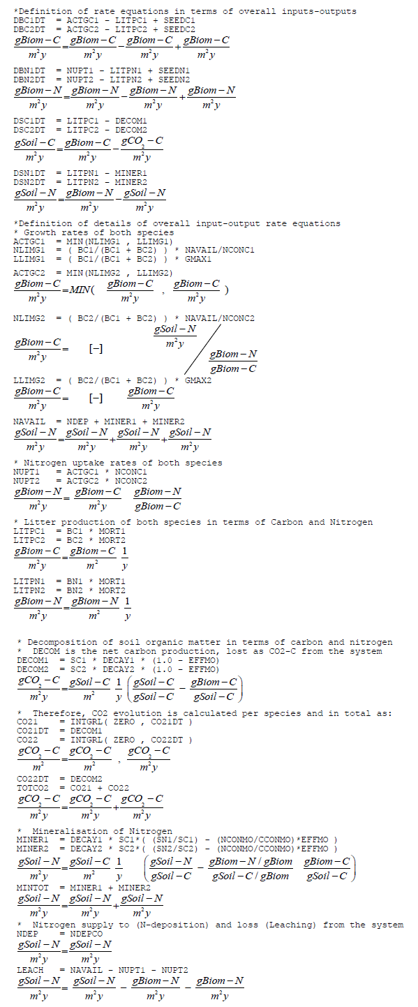Remark: Note that unit analysis is more informative than dimension analysis. In dimension analysis you may for instance refer to length, time and mass. In unit analysis, you would refer to length by (for instance) meters, time by seconds, and mass by grams. Moreover, you better specify the unit analysis by adding the biological, physical or chemical meaning for a variable. For example, we should write for the leaf area index of a vegetation “m2 leaf area m-2 soil”, because this is more informative than only “m2 m-2”, and this improves the model check.
