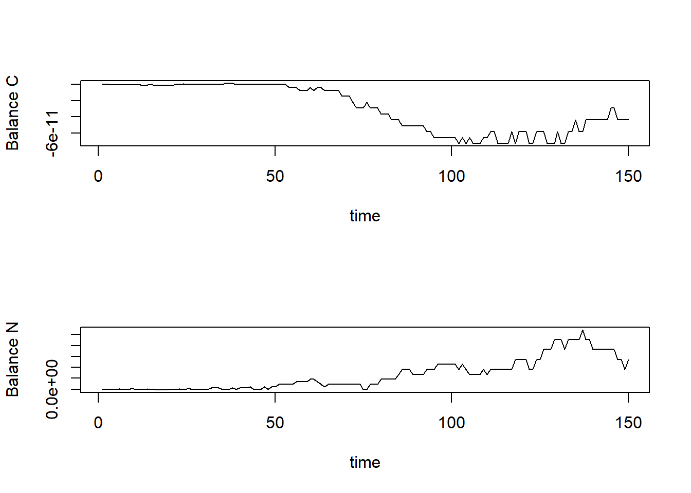 plot(balance[,"time"], balance[,"NBAL"], type="l", xlab="time", ylab="Balance N")