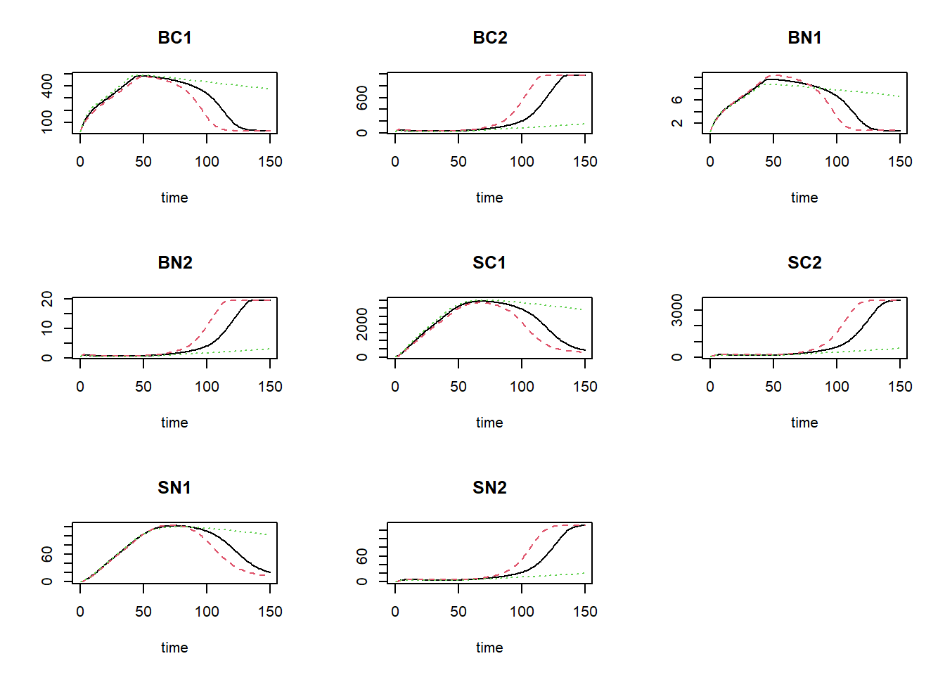 Also, we can plot the modelled pattern of state “BC1” as function of time, including the measured values of “BC1”: